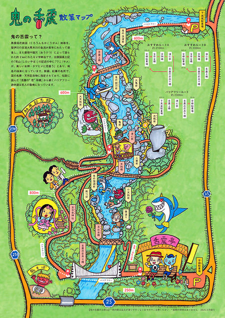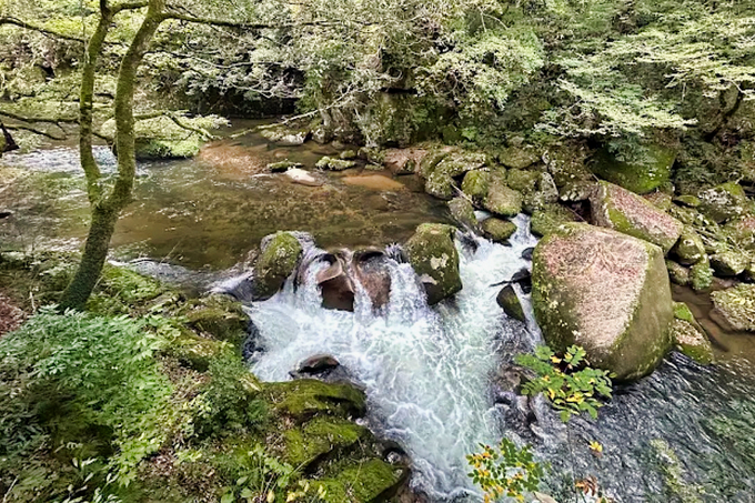 こちらの奇岩は、顔面のような形の岩に開いた2つの甌穴を水が流れる様がまるでワニ(鬼)が涙をこぼしているように見えるところから、鬼の落涙岩(らくるいいわ)と呼ばれます。