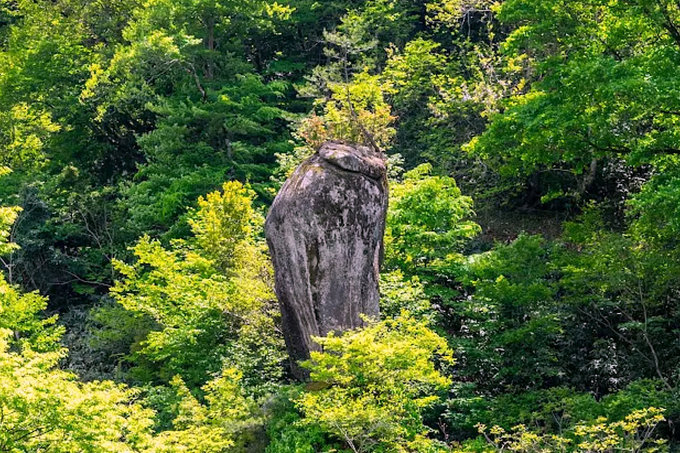 高さ約30mの山肌の岩上に一つだけ垂直に立つ水瓶岩(はんどいわ)は、昔水を貯めておいた水瓶に見えることからそう呼ばれ、渓谷内で最も有名な奇岩です。