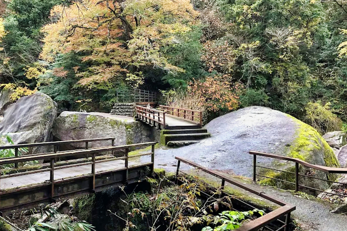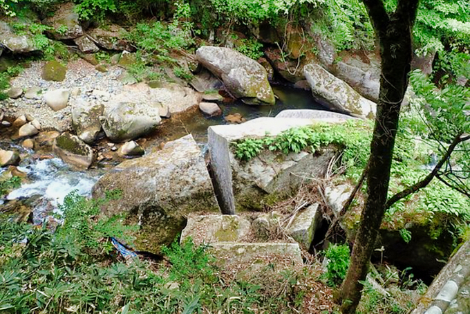 こちらは、水瓶岩の近く、岩と岩の間に橋を渡して対岸に渡れるようにしているところで、奥の平たい岩が畳岩、手前が飯釜岩といいます。