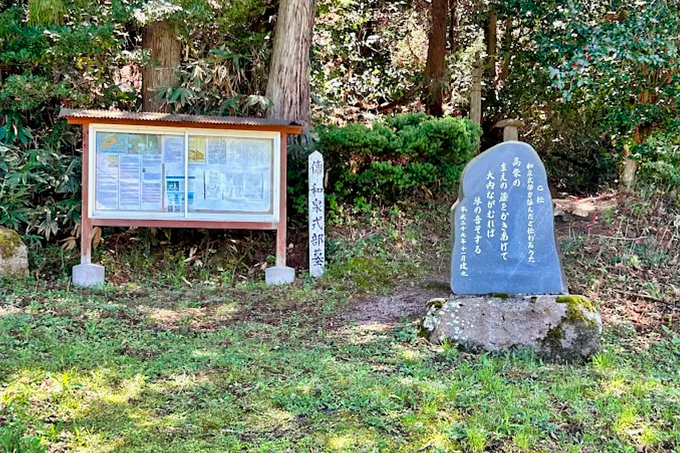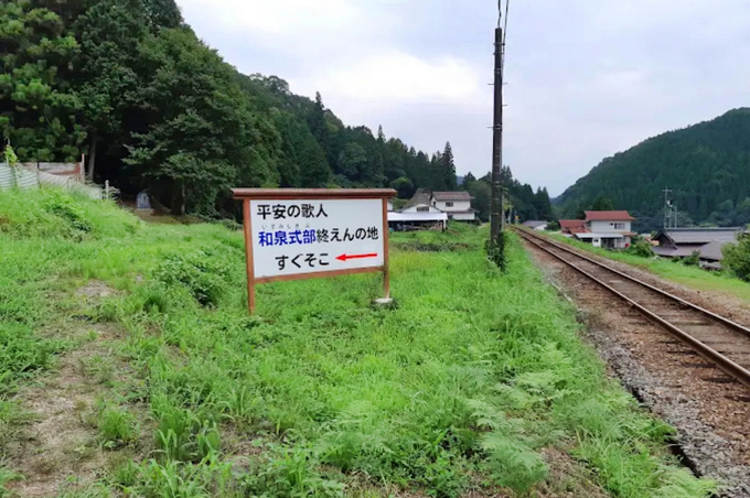 雅は、予約している民宿に向かう途中、「和泉式部終えんの地」の案内板が立っているのを見て、踏切のない線路を渡り、立ち寄ることにします。駅から南西に歩いて3分ほどです。
