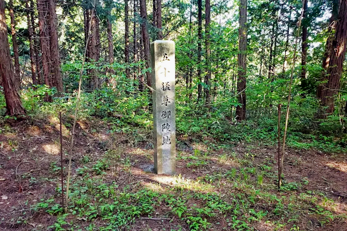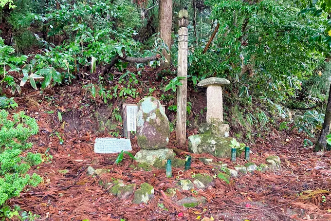 和泉式部の墓は、林に少し入ったところにひっそりと立っています(写真右の石塔)。左の小さな自然石の石碑は、里人が哀れんで一緒に祀ったという娘の小式部内侍の墓です。近くには、作中にあるとおり、地方官として赴任した夫を追って九州に向かう途中、この地で病を得て没したと書かれている説明板もあります。