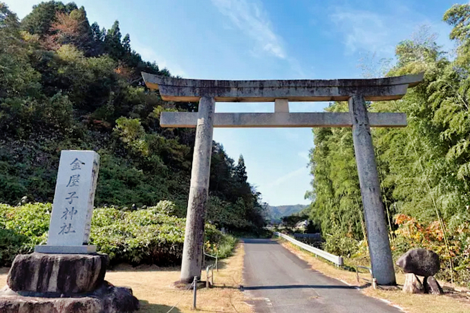 翌日、雅は、源太の車で、まず島根県安来市広瀬町の最奥部西比田にある金屋子神社に向かいました。途中、源太が昨日遺体を発見し、そのときも櫛が川を流れてきたという話を聞いていると、車は大鳥居をくぐりました。高さ9mの鳥居は、明治14年(1881年)建造の御影石造りで、石造りの鳥居として日本一と紹介されています(前旅(第25節)で紹介した須我神社の一の鳥居は、同じくらいの高さで山陰最大級でしたが)。雅たちが訪ねた当時は、まだ左側の社号標はなかったかもしれません。