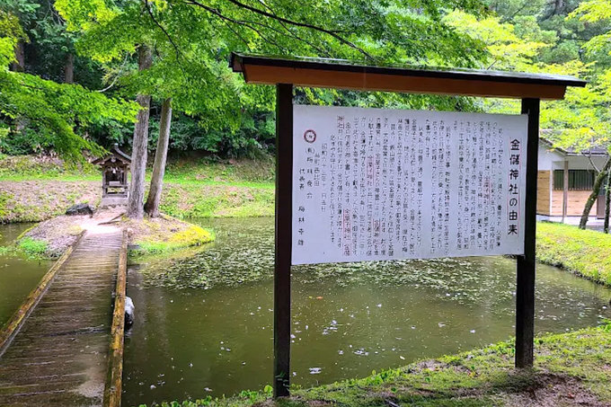 作中にあるとおり、参道の右手に池があり、池の中の小島にある小さな祠(金儲神社)まで細い道が延びています。見えている説明板によれば、金屋子神社の宮司に養子として養われた方が、神社を掃除中に偶然金屋子神の使いの白蛇を見つけて、その体を洗い清めたところ、霊威を得て会社を設立できたことに感謝して、金が儲かり金運が授かるとのお告げに従い、造営寄進したという社のようです。