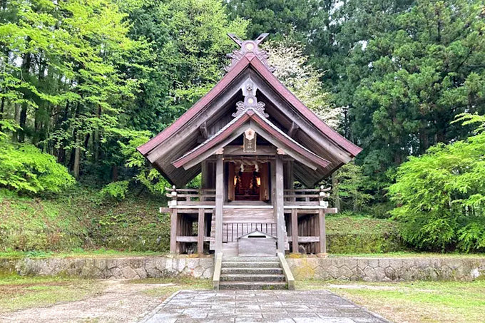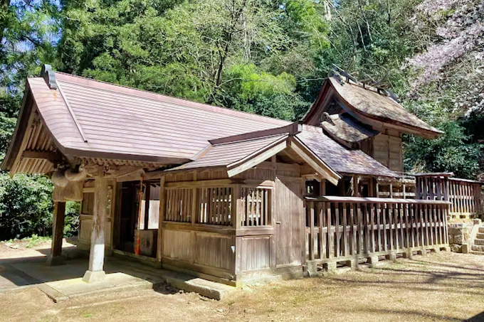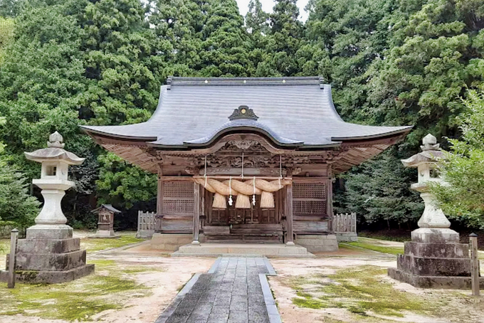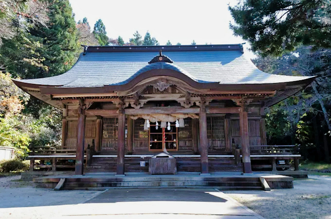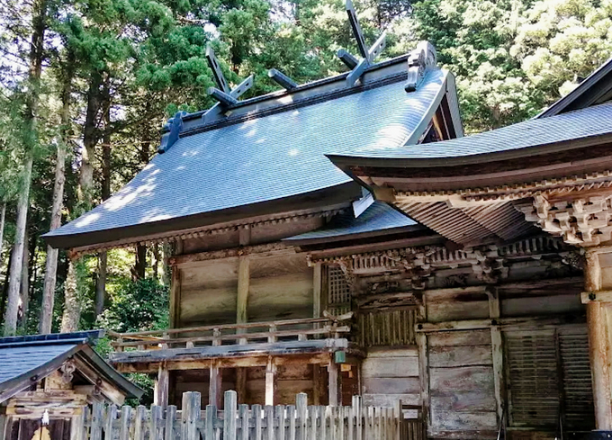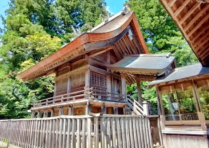 本殿は、大社造り、切妻造りの妻入りで、男千木、奇数本の鰹木が載っています。