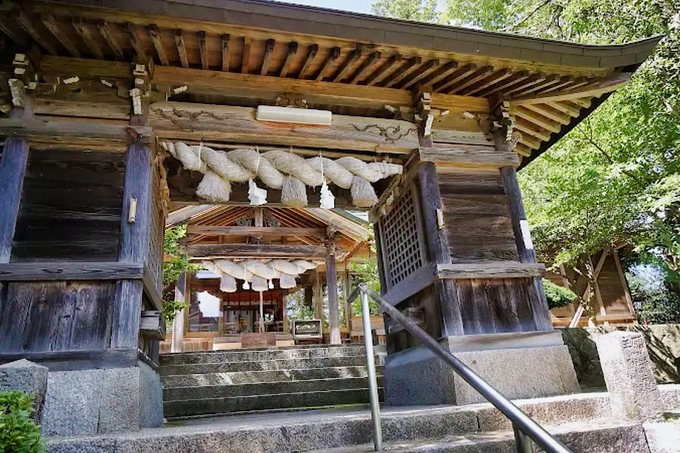 境内奥にある本殿は、大社造り、切妻造りの妻入りで、女千木、偶数本の鰹木が載っています(別角度の写真参照)。神紋の「二重亀甲に姫」も確認できます。