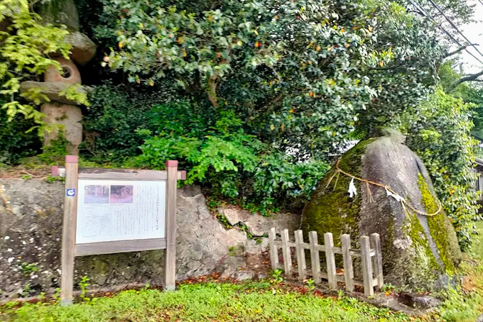 雅が目を留めた、「スサノオの埴船(はこぶね)が岩化した岩船大明神」と書かれた説明板と注連縄が巻かれた巨岩です。大鳥居の右側にあります。