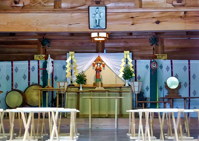 作中にある、拝殿奥の正面に飾られた奇稲田姫の像と、上部の鴨居に飾られた姫の絵というのはこちらです。
