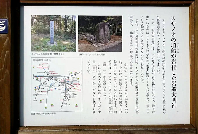 雅が目を留めた、「スサノオの埴船(はこぶね)が岩化した岩船大明神」と書かれた説明板と注連縄が巻かれた巨岩です。大鳥居の右側にあります。