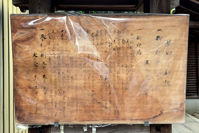 作中にあるように、由緒書は文字が擦れて殆ど読めませんが、桓武天皇の勅願によって創建され、かつては広大な敷地を持ち、将軍足利義満の奉幣も伝えられるなど由緒ある古社で、応仁の乱以後度々火災に遭い、寛政5年(1793年)に現在地に移されました。