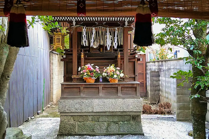 格子戸を覗くと、御簾の向こうに銅板葺きの流造り一間社の小さな本殿が建っています。私が訪れたときはお酒だけでしたが、この写真では、作中同様、綺麗な花が飾られていますね。