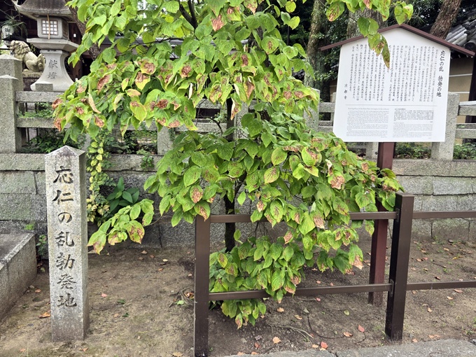 石鳥居の右側には、「応仁の乱勃発地」の石碑があります。応仁の乱は、文正2年(1467年)1月18日に畠山政長がこの神社の境内(御霊の森)に陣をしき畠山義就と戦いを交えた御霊合戦が発端となったとされています。