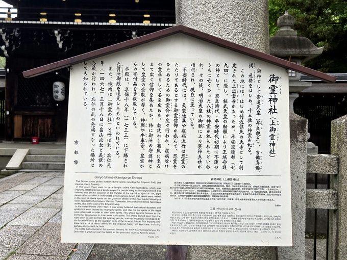 こちらが鳥居前の説明板で、作中にある「上出雲寺」の記述があります。天穂日命(あめのほひのみこと)を始祖とする出雲族が平安遷都以前に出雲地方から丹波を経て移住して、この地は「出雲郷(山背国愛宕郡)」と呼ばれるようになり、出雲族の氏寺として出雲寺が創建され(延暦年間に伝教大師が開創したとも言われます)、その後上下二寺に分かれ、上出雲寺は上御霊神社の境内付近にあって(鎮守社であったとも言われます)荘厳な伽藍を誇った大寺とされ、現在も境内から当時の瓦が出土されることがあり、下出雲寺は相国寺辺りにあったと考えられています。出雲族は、紙漉きなど優れた技術を身につけていたとみられ、平安京の貴族や朝廷の下級役人に仕え、鉄製品を生産していたこともわかっていますが、平安時代初期にその勢力は衰退したとされています。