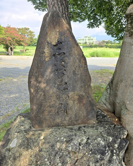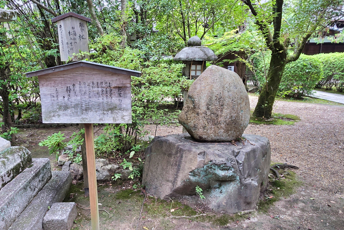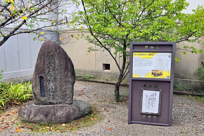 絵馬所の向こうには、参拝を終えた雅も見た「応仁の乱発端の地・御霊神社」と書かれた説明板と「應仁の乱發端 御靈合戦舊跡」と彫られた自然石の石碑が置かれています。石碑の表字は、応仁の乱東軍総大将細川勝元の末裔に当たる元首相細川護熙の筆によるものです。