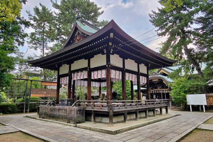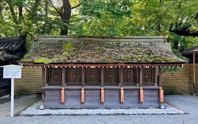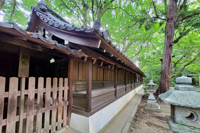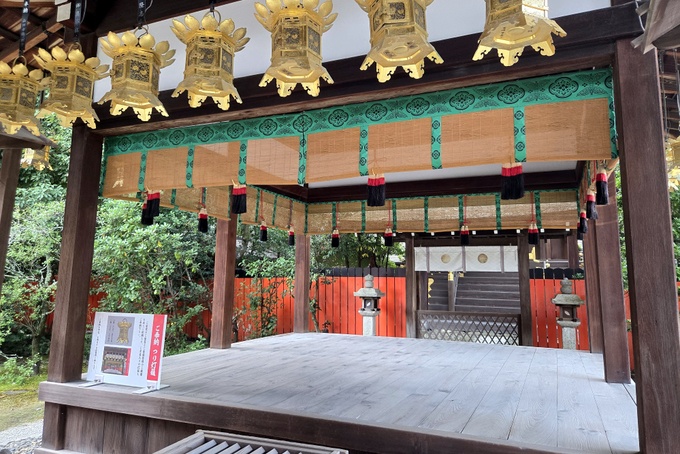 作中には出てきませんが、こちらは御手洗川の上に跨って建つ、桁行4間梁間3間の檜皮葺き、入母屋造りの橋殿です。寛永5年(1628年)の式年遷宮で再建された重要文化財で、御蔭祭のとき御神宝を奉安する社殿で、現在は、名月管弦祭や正月神事などで神事芸能が奉納される社殿としても使用されています。