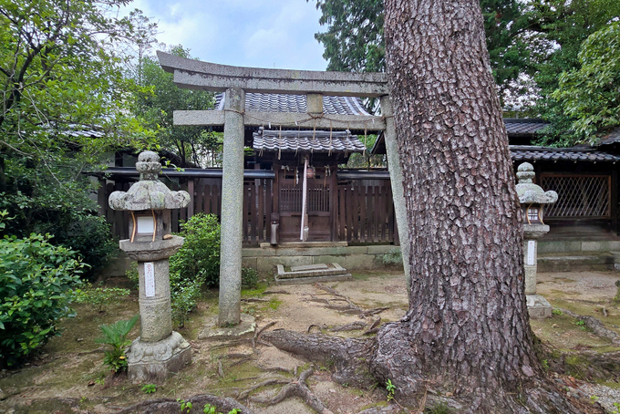 奥の一段高いところに、門構えのような拝所が設けられた、瓦葺切妻造りの社殿が鎮座し、作中にあるように、石灯籠や狛犬の周りに白石が敷かれています(私が訪れたときは、繁った萩に石灯籠や狛犬が覆われていました)。