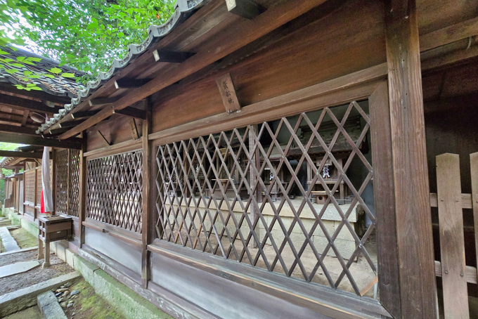 本殿左右には、末社が控えており、写真は、左(南)側の檜皮葺き、見世棚造り一間社の橋本社で、玉津島神を祀っています。