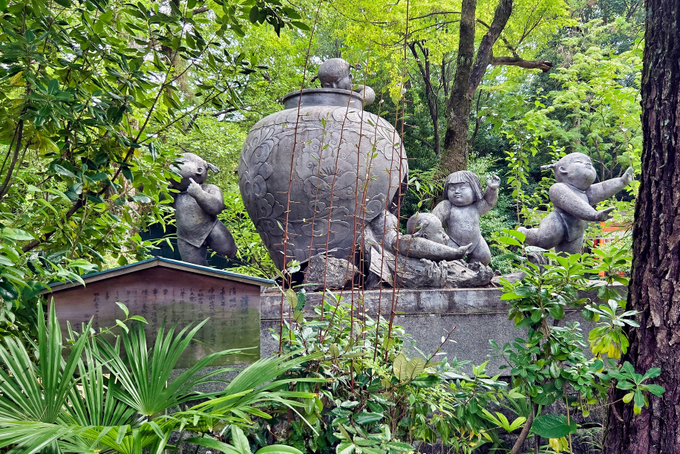 本堂の南には、木々に囲まれた中に、中国宋代の学者司馬温公の甕割りの故事を造型した、清明心(きよきあかきこころ)の像があります。昭和54年(1979年)に国際児童年を記念して、世界の子供たちに生命は物質よりも尊いとの精神を改めて認識してもらいたいとの思いで奉献されたものです。