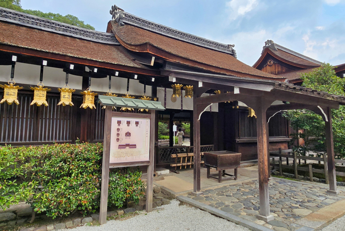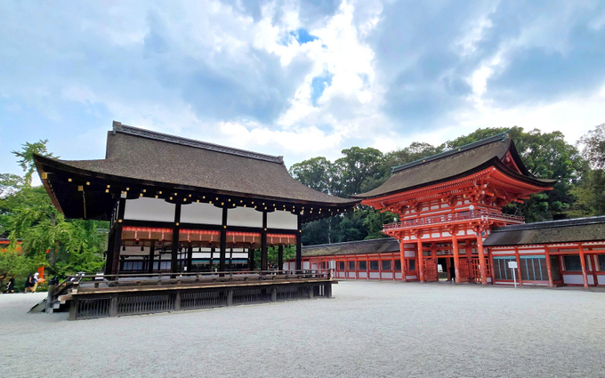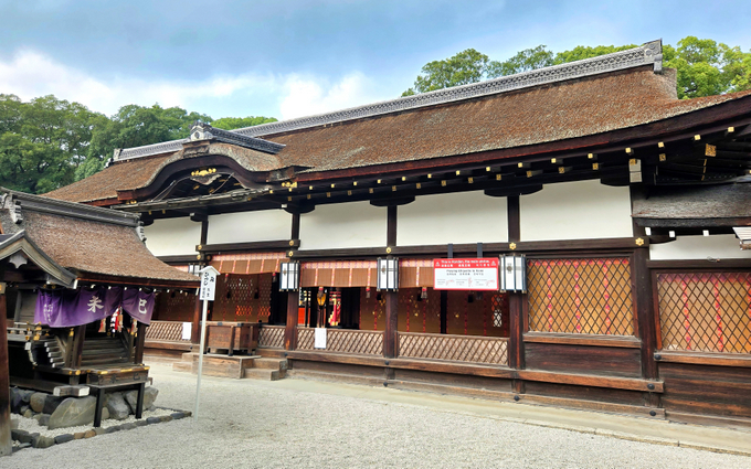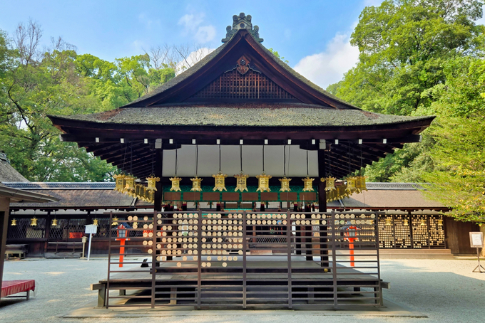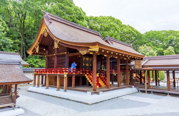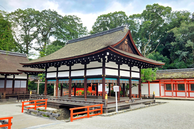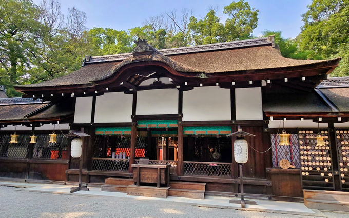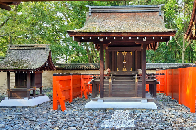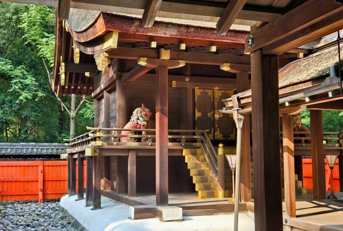 国宝に指定されている本殿は、文久3年(1863年)の式年遷宮で造営された、檜皮葺き、流造りの高床式の三間社(二間の身屋と一間の通り庇)で、扉の右に金の体に緑のたてがみの獅子、左には銀の体に青のたてがみの狛犬が置かれています。西本殿には賀茂建角身命、東本殿には玉依姫命が祀られています。