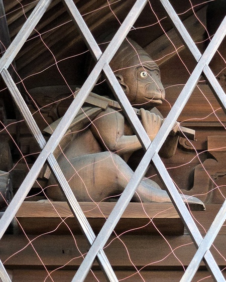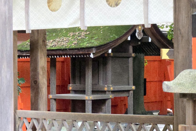 本殿の右に回ると、北東角にこの猿の彫刻があります。猿は「魔が去る」に通じ、鬼門封じの魔除けとなると考えられており、京都御所の北東角に造られた「猿が辻」、この猿像、比叡山麓の赤山禅院の屋根の上の猿、比叡山延暦寺(日吉大社)の神猿(まさる)と、鬼門のライン上に四重に猿が配置されています。