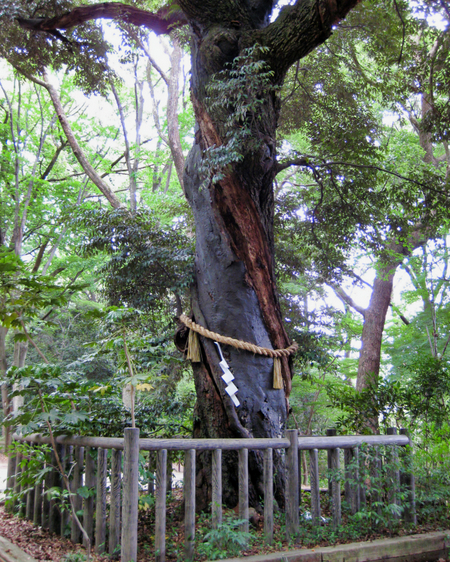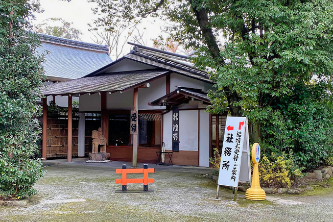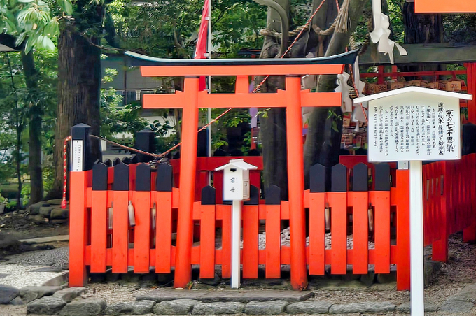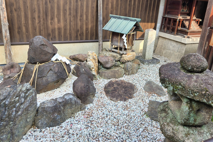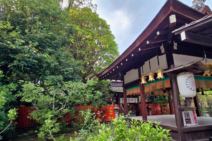社の左側には、4代目の「連理の賢木(れんりのさかき)」が祀られており、根元には子供の木も芽生えているようです。縁結びの神の神威によって2本の木が1本に結ばれたものと言い伝えられており、京の七不思議に数えられています。
