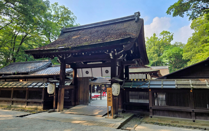鳥居をくぐった参道の先に見えるのは、作中には四脚門とありますが、四脚門は後に紹介する南門の方で、西門は寛政年間に再建されたという楼門です。京都府神社庁サイトでも写真があべこべに貼り付けられています。現在は銅板葺きですが、檜皮葺きで朱塗りの門であったころもあるようです。
