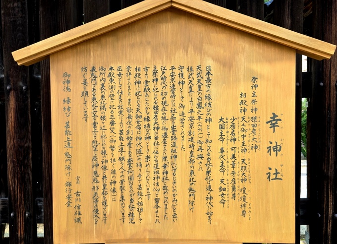 雅が見た由緒書は字が擦れて殆ど読めなかったようですが、現在までに新しく設置されたようです。この由緒書によると、出雲路幸神社(いずもじさいのかみのやしろ)は、主祭神が猿田彦大神で、天之御中主神(あめのみなかぬしのかみ、造化三神の一柱で、日本神話に最初に現れる創造神)、天照大神、瓊瓊杵尊、少彦名神、可美葦牙彦舅命(うましあしかびひこぢのみこと、造化三神の次に現れた4番目の神)、大国主命、事代主神、天鈿女命が相殿されているようです。日本最古の縁結びの神を祀るとされ、起源は神代に遡り、白鳳元年(661年)に再興され、平安遷都時に御所の鬼門(北東)に当たる地に守護神として出雲路道祖神(いずもじさいのかみ)という名称でが造営され、江戸初期に改名して現在地に遷座したようです。出雲の阿国が稚児巫女として仕えたともあります。