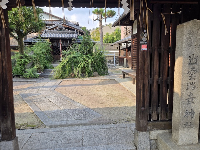 鳥居の後ろに立つ「皇城鬼門除 出雲路幸神社」という社号標を横目に、屈折した参道を進みます。参道が折れ曲がっているのは、怨霊を祀る寺社の特徴の一つだとされ、それを知っている(次の旅で詳しく紹介されます)雅は違和感を覚えます(縁結びの神とされていることとのギャップでしょう)。