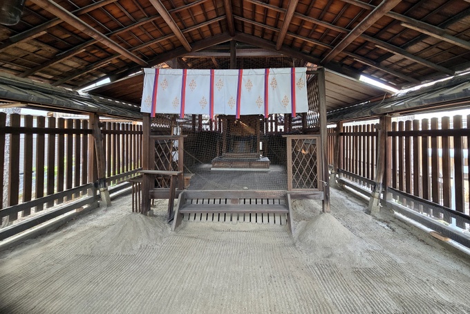 拝所の格子から覗くと、社殿の前に盛り土があり、神社幕の向こうに小さな祠が見えます。