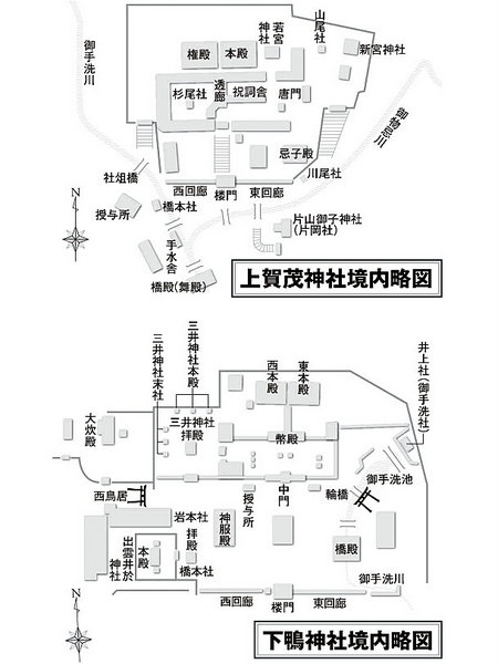 そして、千鶴子は、朝廷は、用済みとなった賀茂氏も抹殺して上賀茂・下鴨両社に怨霊神として祀り、人々にその怨霊を直接拝ませない工夫をしたと言って、上賀茂・下鴨両社の境内図を示して、第12節で見た、本殿を正面から拝むことができない形になってことを説明します。